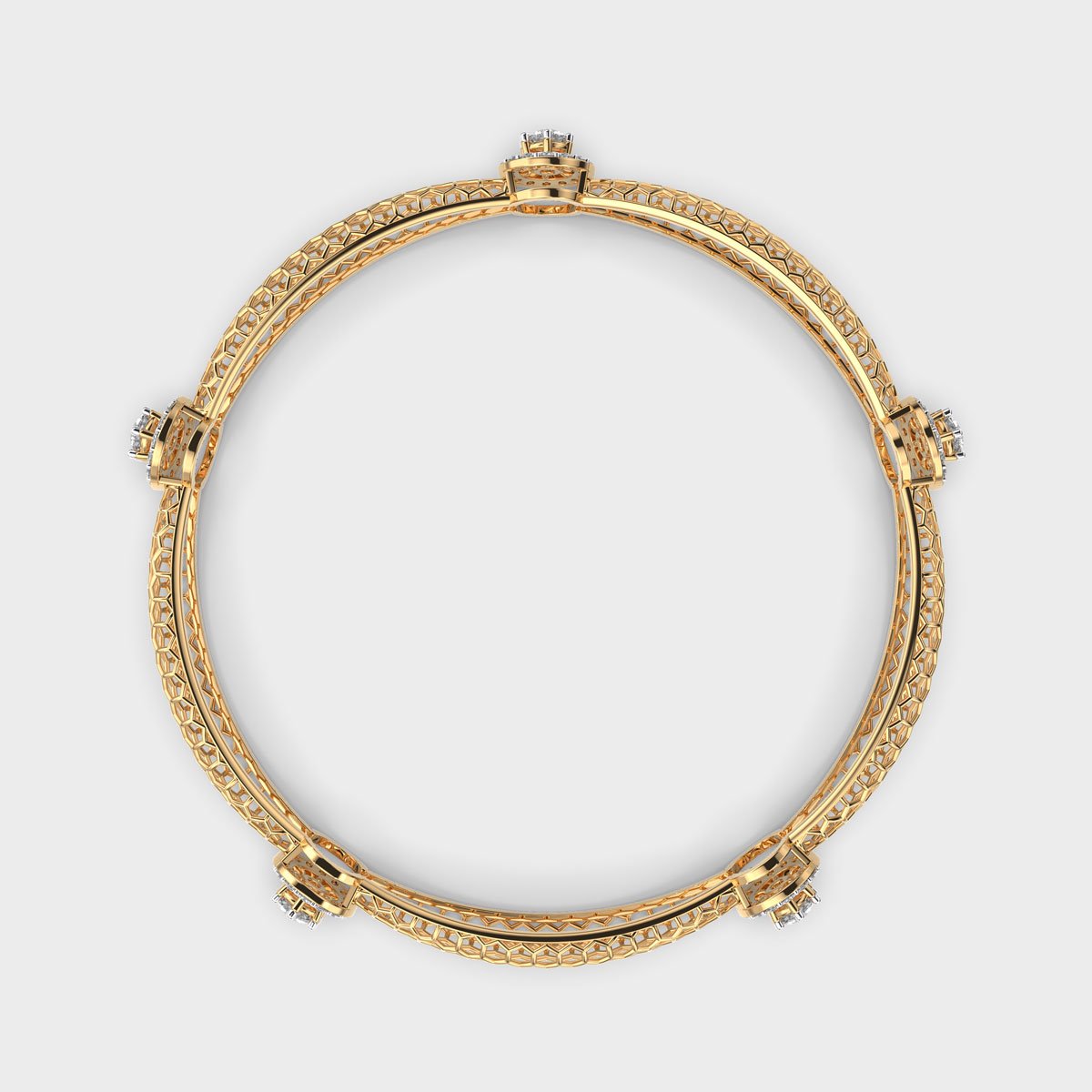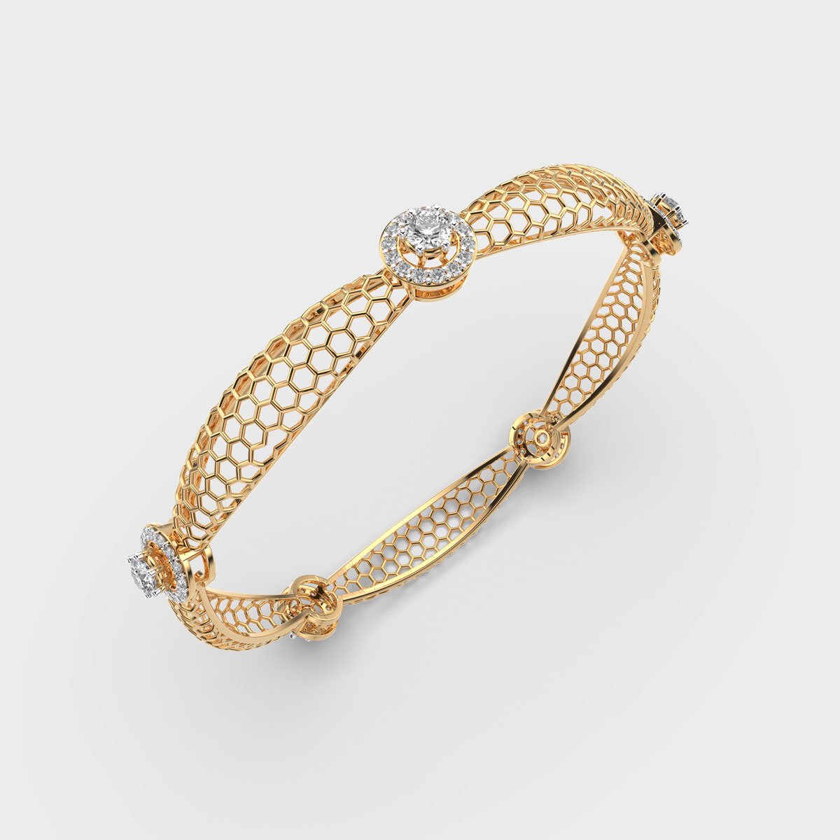 The Celestial Mesh Diamond Bangle captures attention with its honeycomb-patterned goldwork, crowned by a brilliant central solitaire encircled in a shimmering diamond halo. A fine blend of craftsmanship and elegance, this bangle redefines traditional luxury with a contemporary soul.