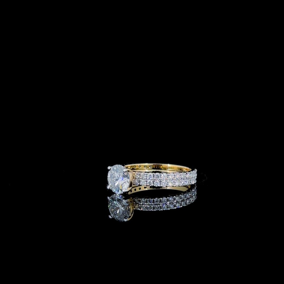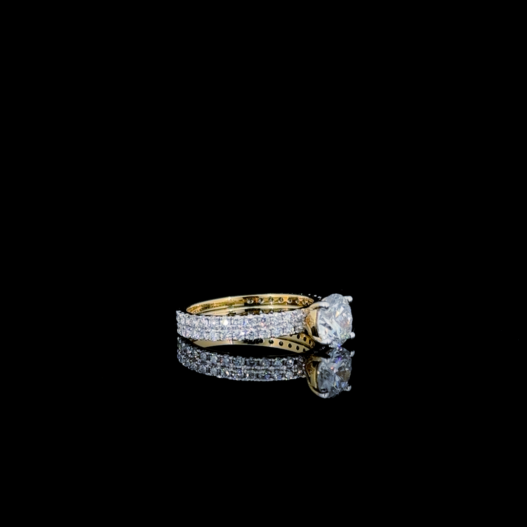An embodiment of grandeur, the Celestia Ring features a commanding round-cut solitaire embraced by twin rows of shimmering diamonds along a polished gold band. The contrast between the brilliant white diamonds and warm gold enhances its regal aura, making it perfect for engagements, anniversaries, or statement moments.