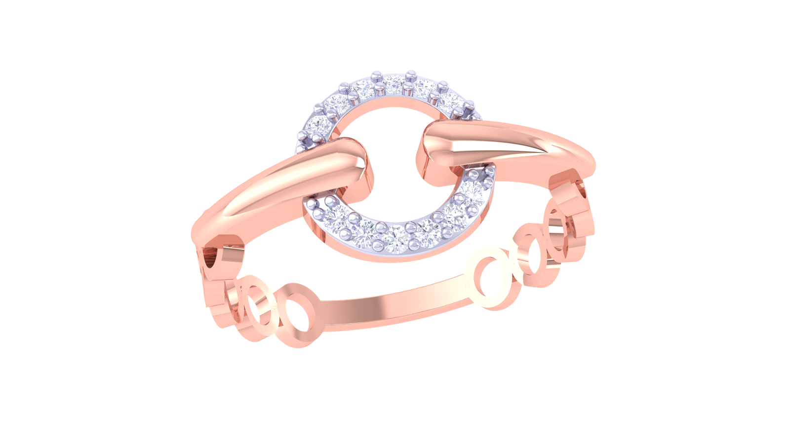 The Eclipse Diamond Ring captures attention with its artistic circular design, symbolizing unity and infinite elegance. Crafted in rose gold with a polished finish, the ring features a diamond-studded crescent that meets bold metal arcs — striking a perfect balance between modern geometry and classic luxury.
