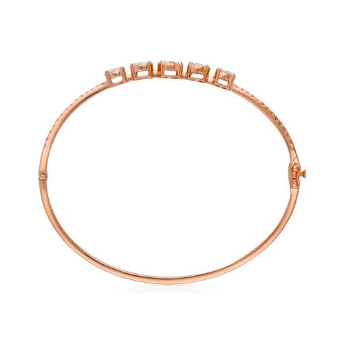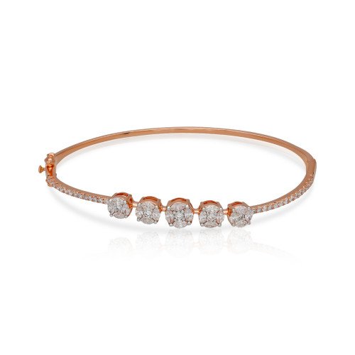 Grace your wrist with the timeless beauty of the Eterna Bloom Bangle, featuring five dazzling floral diamond clusters, each crafted to perfection. Set in luxurious rose gold, the sleek design is further enhanced with a delicate trail of diamonds, making it a piece that speaks of grace and glamour.
