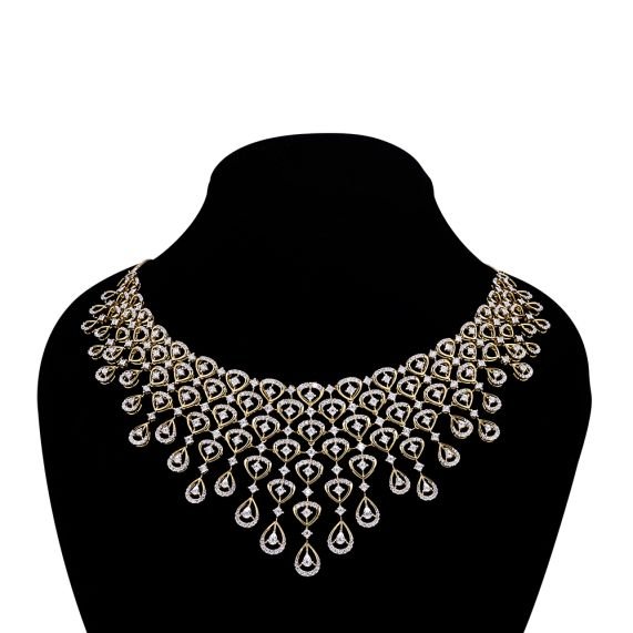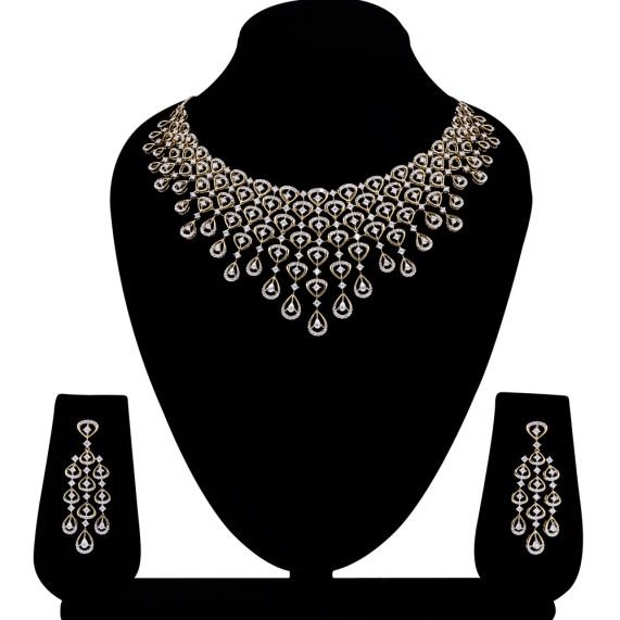 Exude elegance with the Golden Cascade Diamond Necklace Set, a timeless masterpiece designed for women who adore delicate luxury. Featuring tiered teardrop motifs adorned with sparkling white stones, this set perfectly balances simplicity and sophistication. Paired with gracefully matching drop earrings, it’s a go-to for weddings, receptions, or your next celebration.