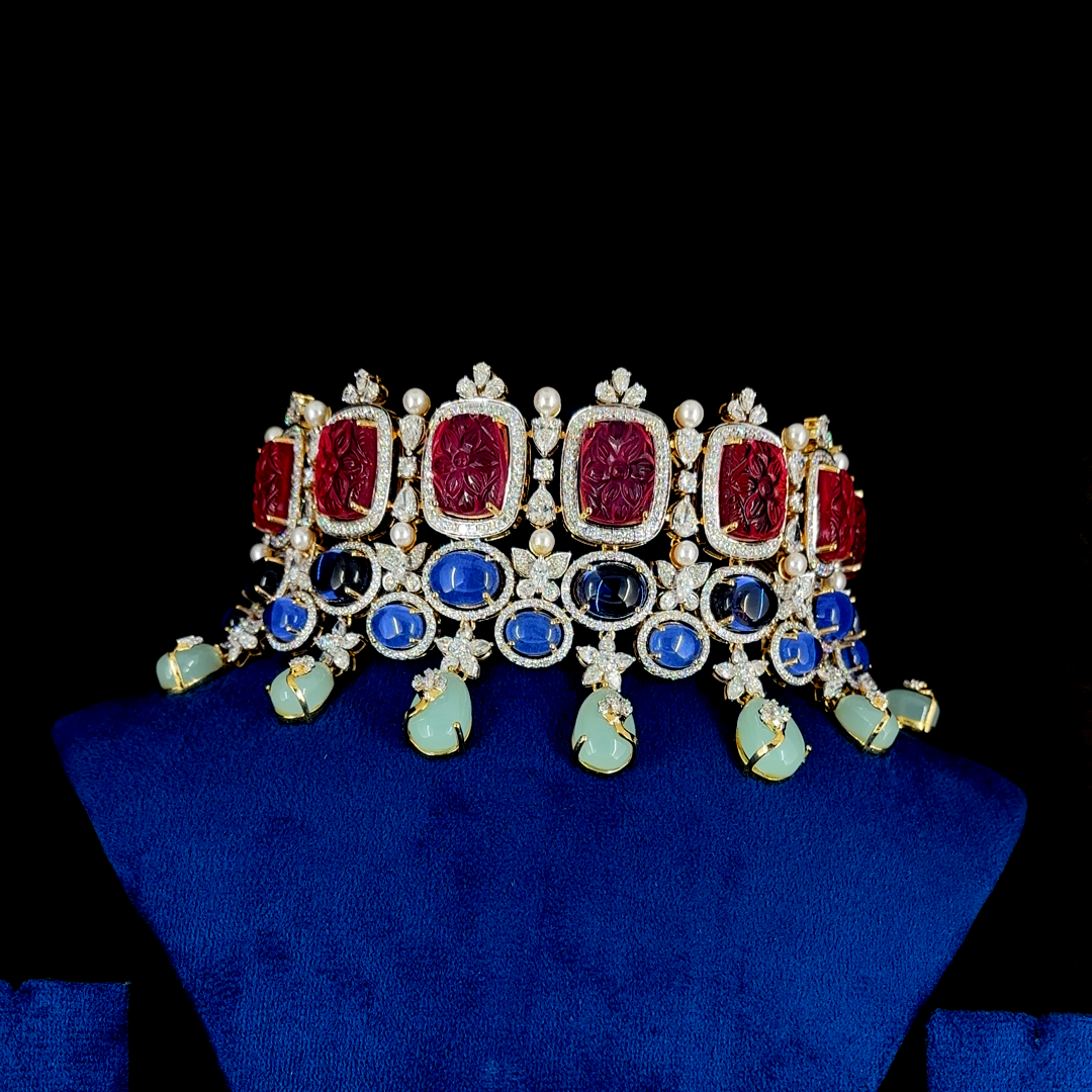 The Rajwada Heirloom Choker is a tribute to regal splendor and artisan mastery. Intricately crafted with hand-carved deep ruby stones framed in kundan-style gold, this choker radiates vintage royalty. Accented by royal blue cabochons, pearl clusters, and mint-green drop charms, it is a celebration of colors and cultural elegance.